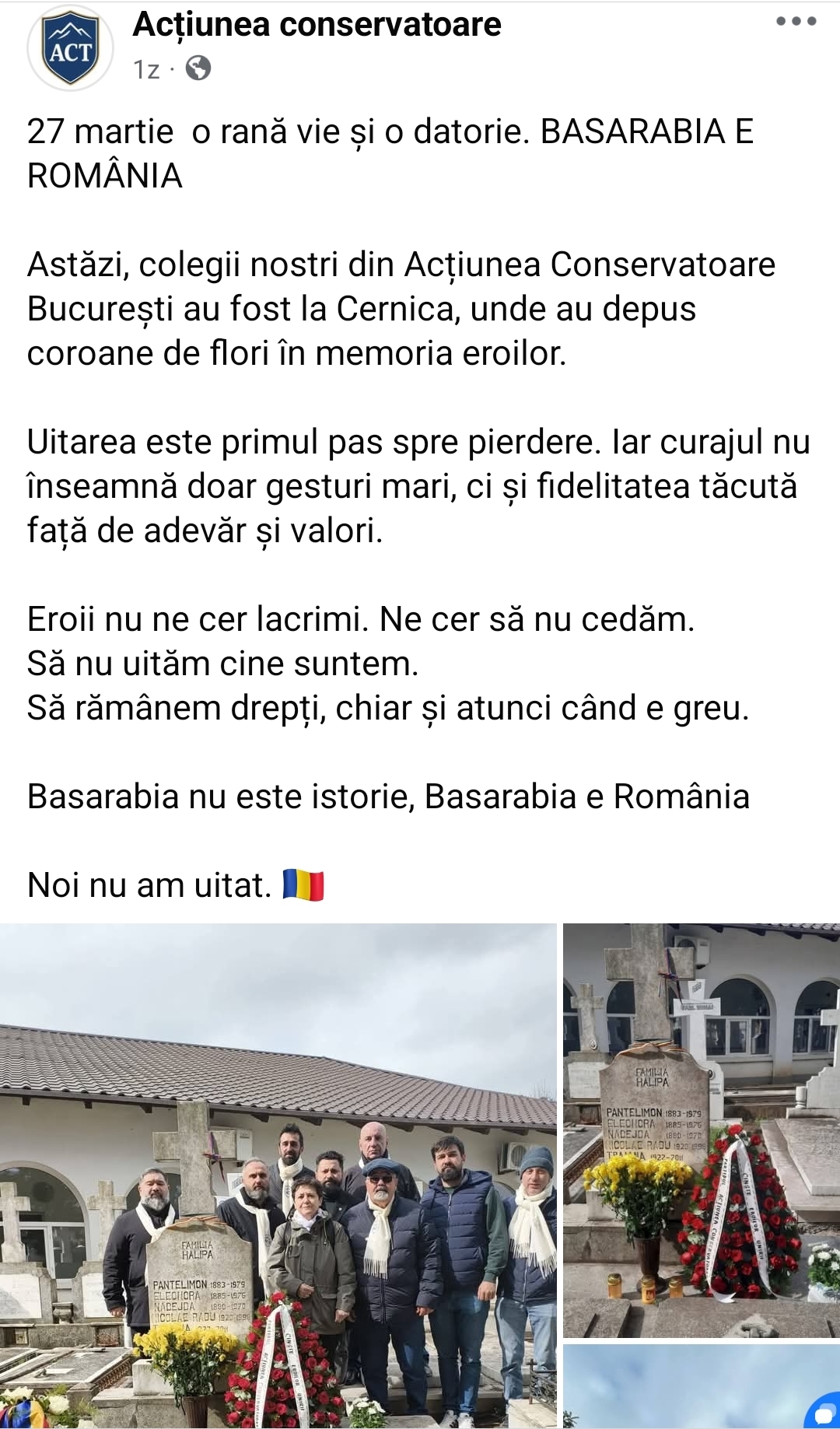 A doua acțiune, comemorarea eroilor și mesajul „Basarabia e România”,  transmite un semnal puternic: istoria nu se uită, iar identitatea națională nu este negociabilă. La Cernica, membrii ACT au depus coroane și au arătat respect pentru cei care au luptat pentru această țară.Două acțiuni diferite, dar unite de același crez: credință, familie și națiune. Într-un peisaj politic dominat de promisiuni și calcule, ACT vine cu un mesaj simplu, pe înțelesul tuturor: