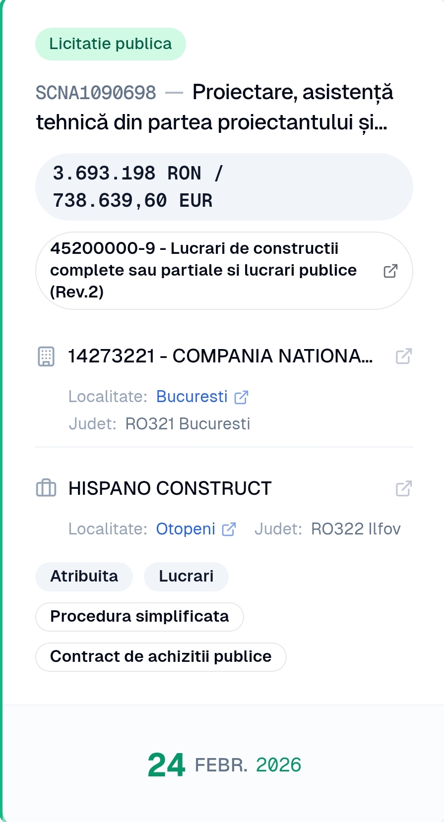 Proiectare, asistență tehnică din partea proiectantului și execuție lucrări pentru obiectivul de investiții: „Centru multifunctional de zi in sat Stoina, comuna Stoina, LOT 12, judetul Gorj” va fi realizată de aceiași firmă Otopeni, judetul Ilfov care a câștigat investiția în 2023. Licitația a fost organizată tot de către CNI.