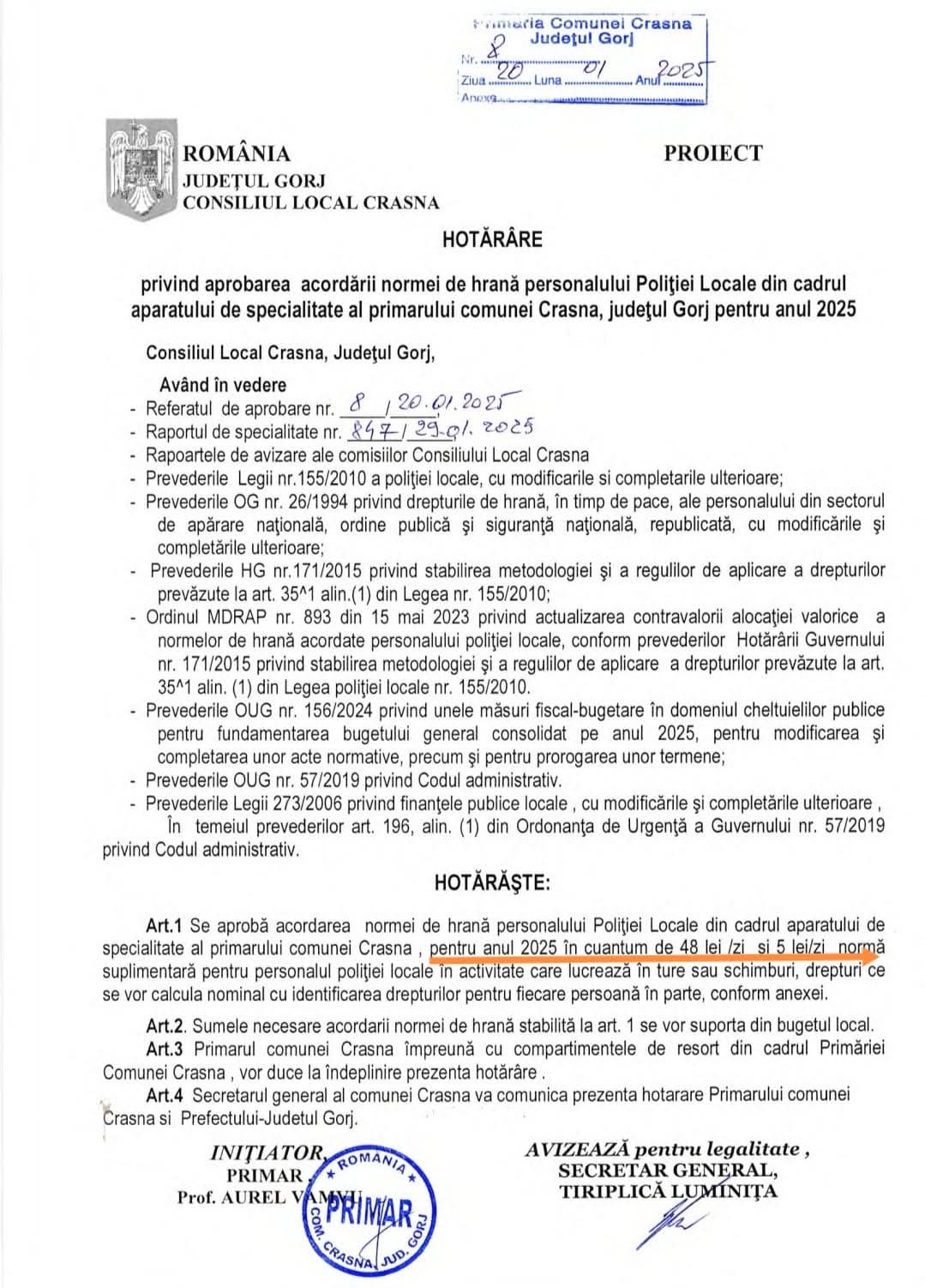Majorarea normei de hrană pentru polițiștii locali din Crasna, proiect aprobat de primarul comunei, Aurel Vamvu, nu a trecut de votul a șase consilieri care formează Opoziția din Consiliul Local. Primarul PSD ceruse ca norma de hrană să crească la 48 de lei/ zi și la 5 lei pentru polițiștii care lucrează în ture ori în schimburi. Șase consilieri nu au aprobat proiectul, printre ei fiind și unul de la AUR care ceruse desființarea Poliției Locale Crasna.
