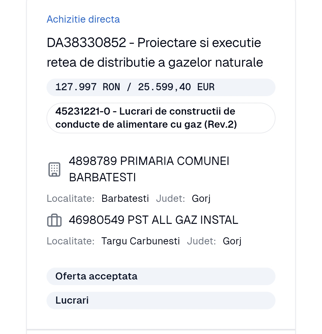 Firma din Târgu Cărbunești se va ocupa, mai exact, de realizare, proiectare și execuție rețea de distribuție gaze naturale, DN 90, material PEHD PE100 SDR 11. Pretul este pe metru liniar, anunță firma câștigătoare fiind vorba despre 363,63 RON. În speță este vorba despre realizarea a 352 metri liniari de conductă.